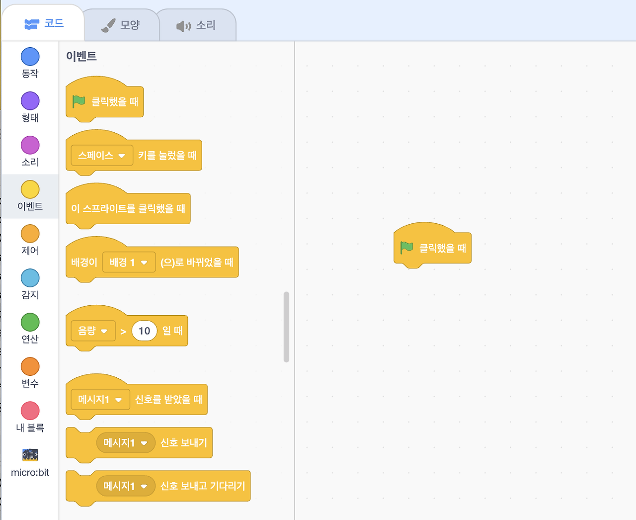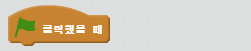 녹색 깃발은 스크래치로 만든 프로그램의 시작을 명령하는 것입니다. 이 이벤트 블럭 아래에 명령어 블럭을 붙이면 깃발이 클릭 되었을 때 명령어 블럭들이 실행됩니다.