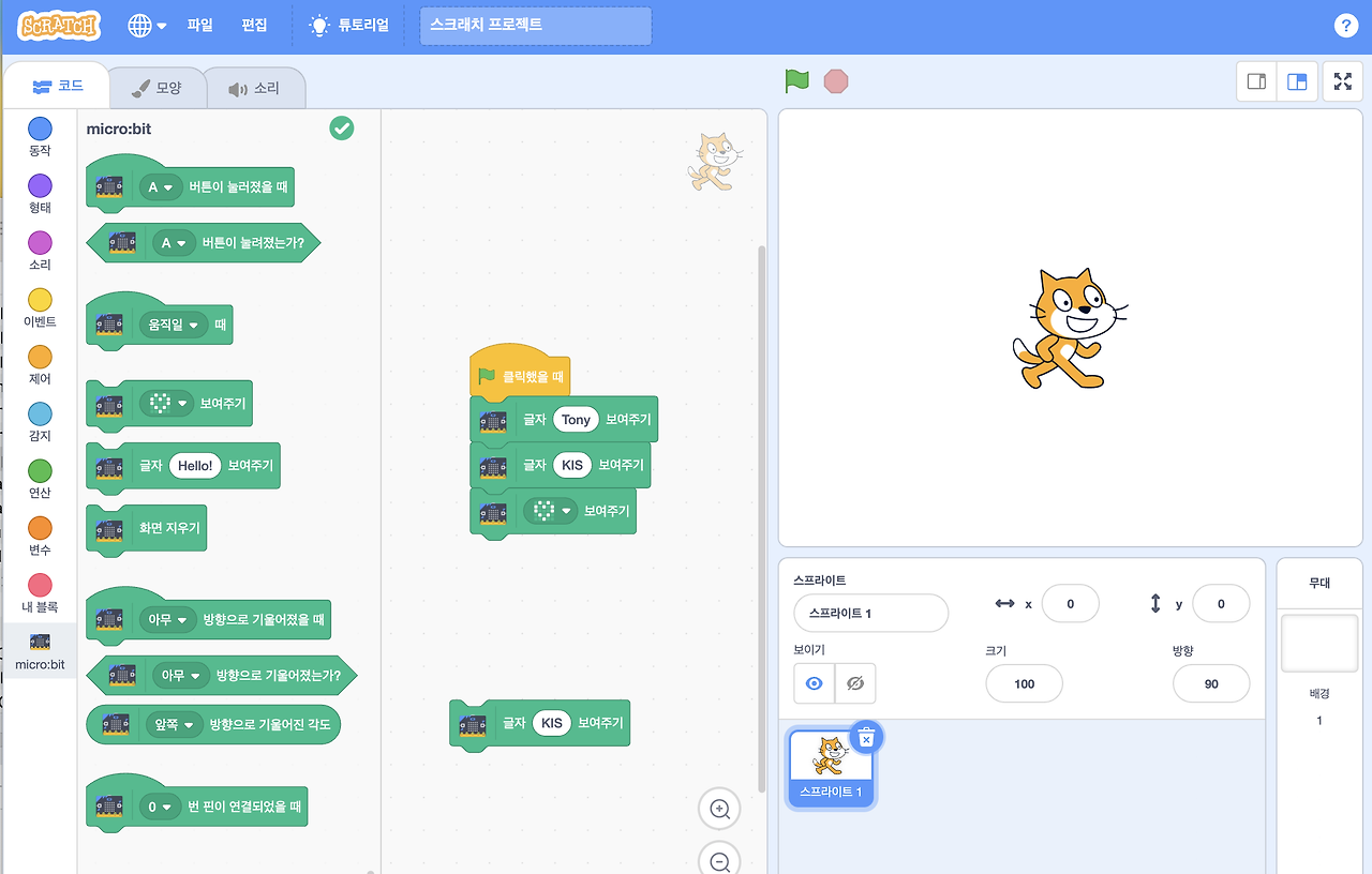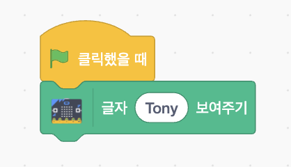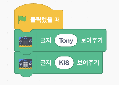스크래치에 녹색 깃발을 클릭 했을 때 마이크로비트에 "Tony KIS ♡” 문자열 텍스트를 출력 하도록 코딩 해보겠습니다.