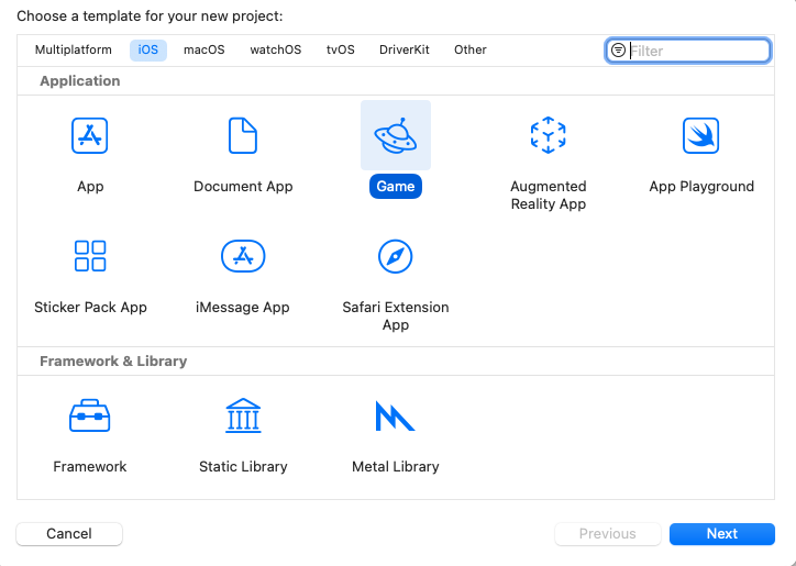 Xcode를 열어 Game용 프로젝트 하나를 생성한다.