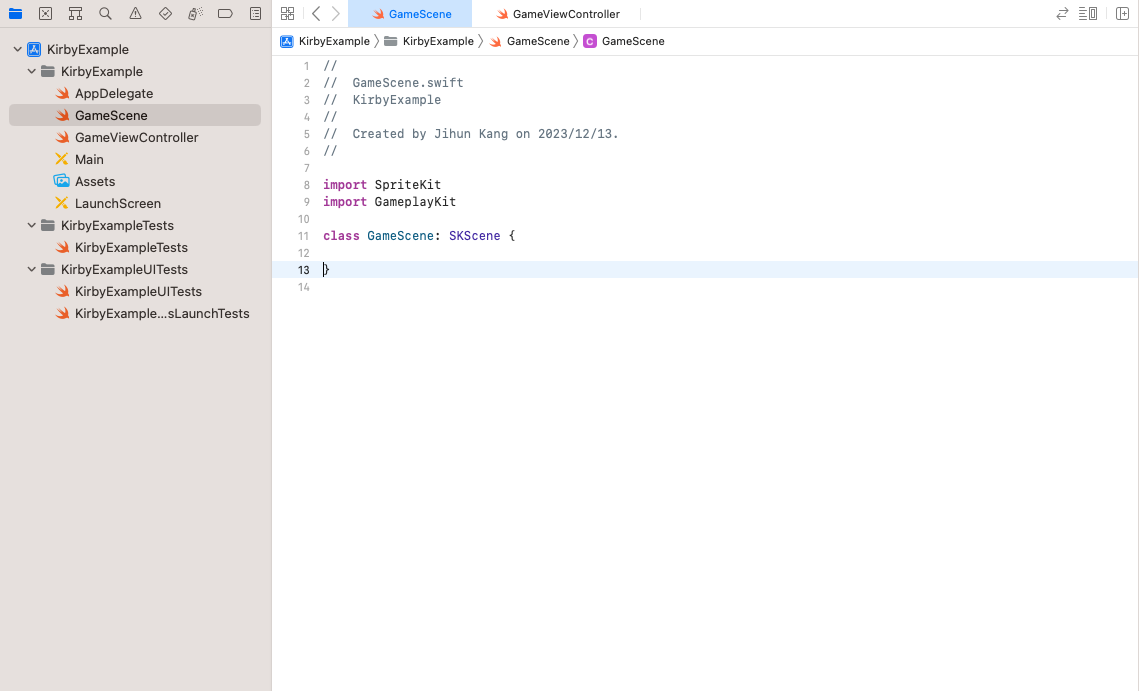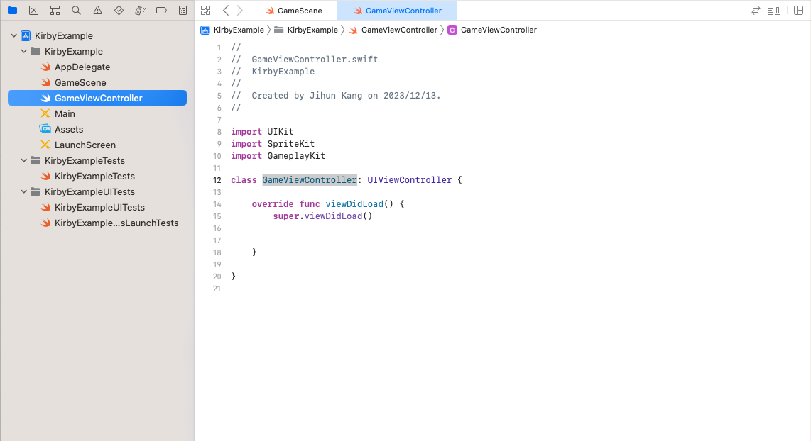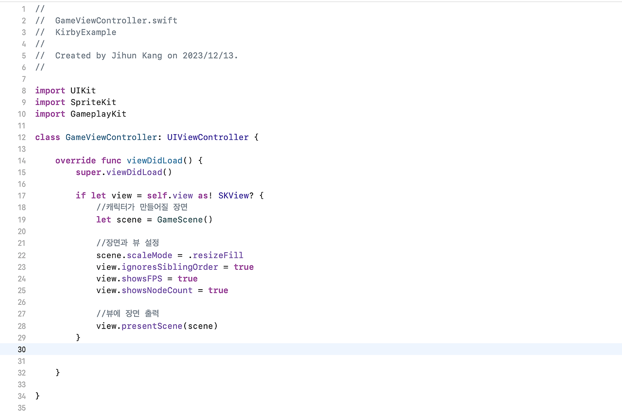 뷰와 장면을 생성하기 위해서 GameViewController에 View와 Scene을 추가 합니다.
