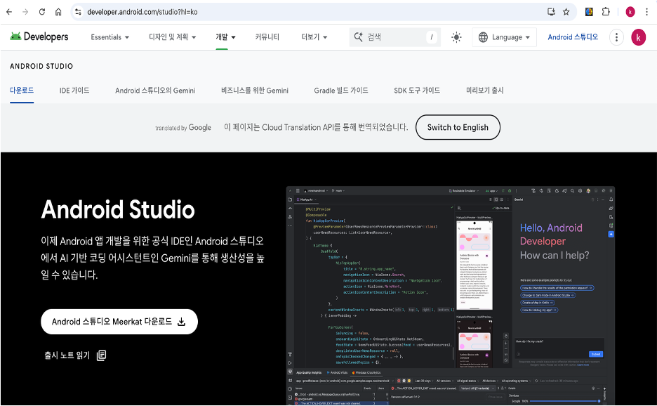 안드로이드 스투디오 공식 웹 사이트(https://developer.android.com/studio?hl=ko)