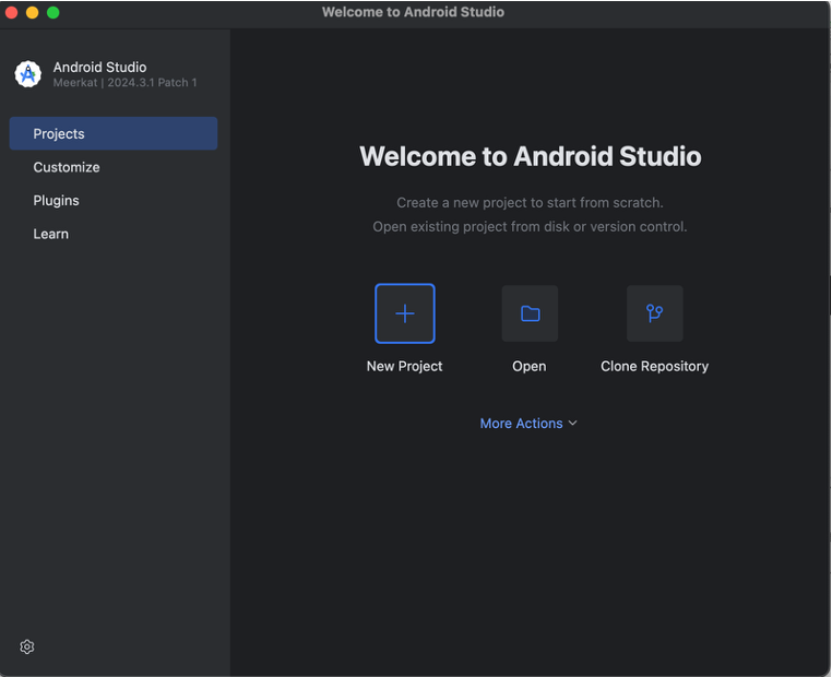 다운로드한 ‘. android-studio-2024.3.1.14-mac_arm.dmg’ 파일을 더블 클릭해서 실행합니다.