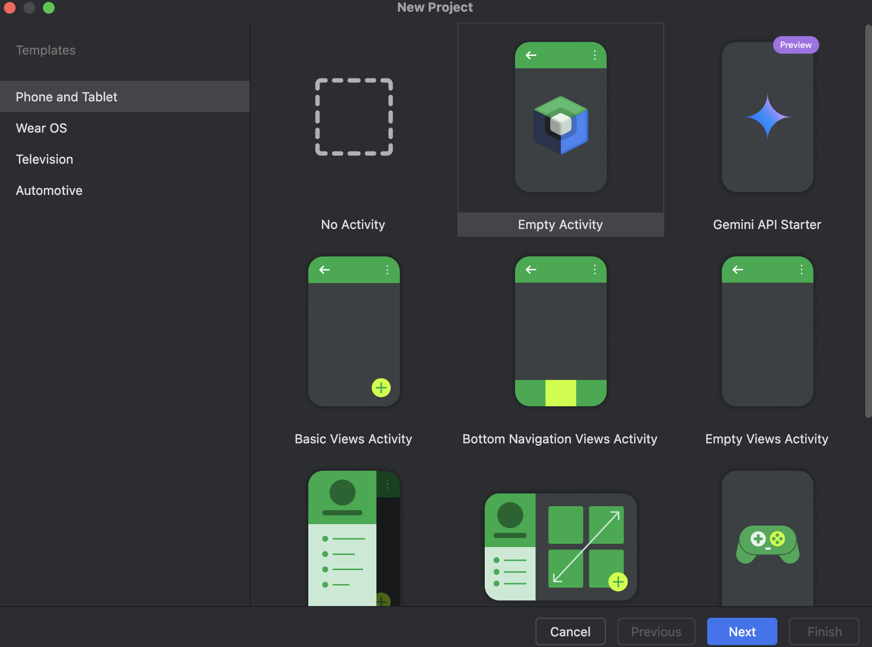안드로이드 스튜디오에서 "New Project">"Empty Activity"로 새로운 프로젝트를 다음과 같이 생성합니다.