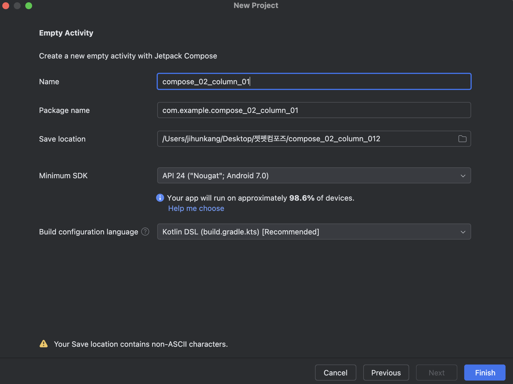 프로젝트 이름을 "compose_02_column_01"이라고 입력하고 프로젝트를 생성합니다.