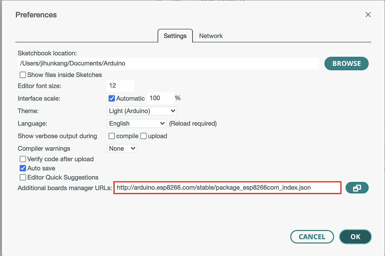 맨 아랫줄에 다음의 URL을 입력한다. http://arduino.esp8266.com/stable/package_esp8266com_index.json 입력 후 확인 버튼을 눌러서 창을 모두 닫아준다.