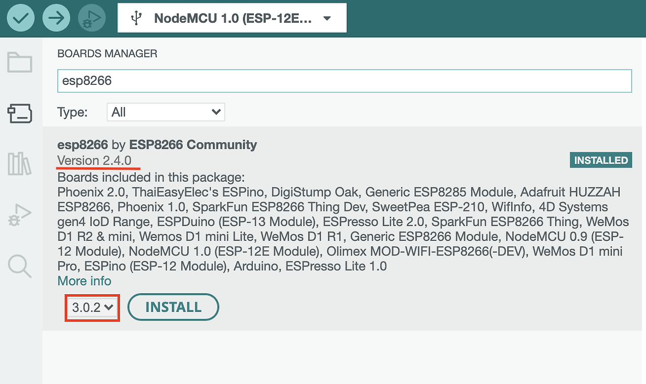 툴->보드->보드매니저 에 들어가면 맨 아랫쪽에 ESP8266 보드 설치가 뜬다. 버전을 2.4.0으로 변경하고 '설치'를 클릭해서 설치해 준다. 최신버전으로 하게 되면 이유없이 죽는 현상이 발생합니다.