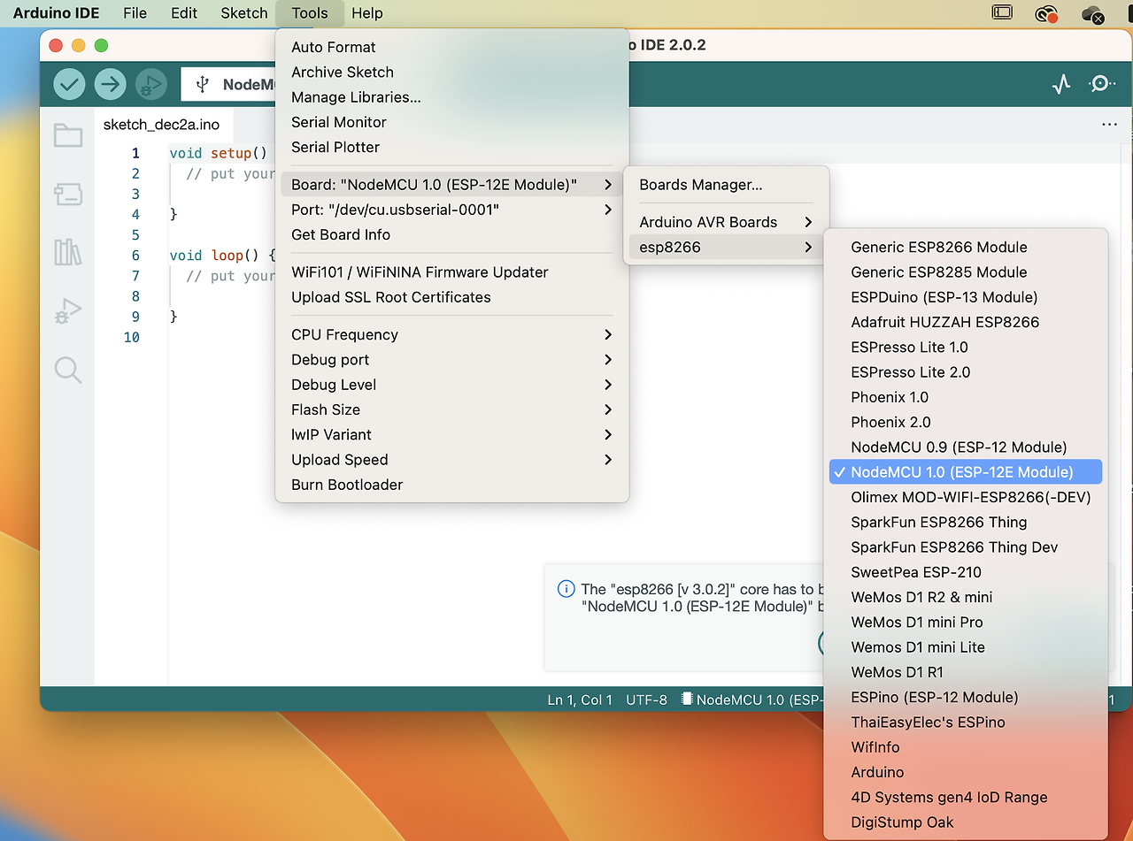 툴->보드 로 들어가서 자신의 제품에 맞는 ESP8266 모듈을 선택한다. 나의 경우엔 ESP-12E 모듈을 선택하니 잘 된다.
