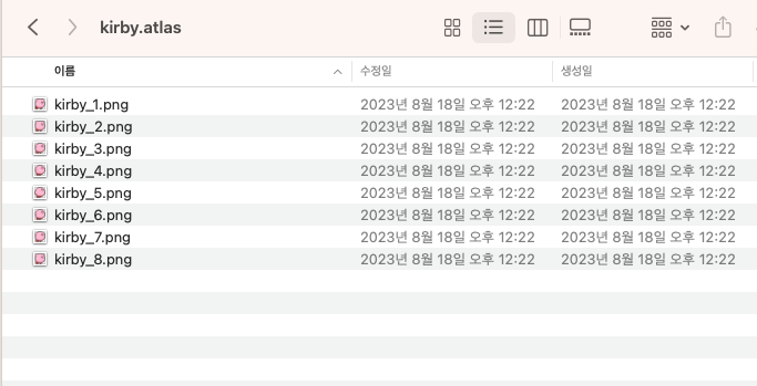 다음과 같이 xxxxx.atlas 로 끝나는 폴더를 생성하고 애니메이션 이미지 파일을 복사합니다